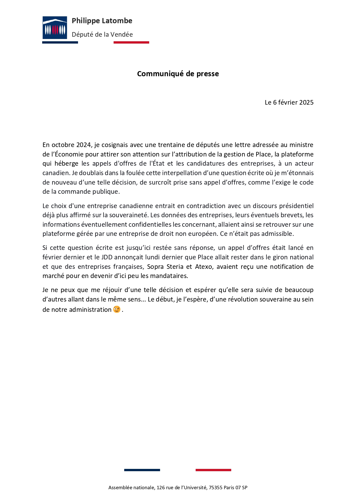 Le député Philippe Latombe communique - sur l’attribution de la gestion de Place à Sopra Steria et Atexo