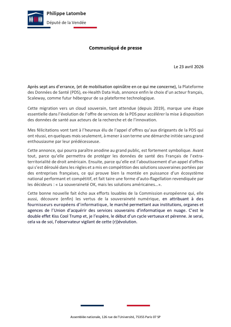 Le député Philippe Latombe communique sur le choix de l'hébergeur Scaleway pour la Plateforme des Données de Santé(PDS)