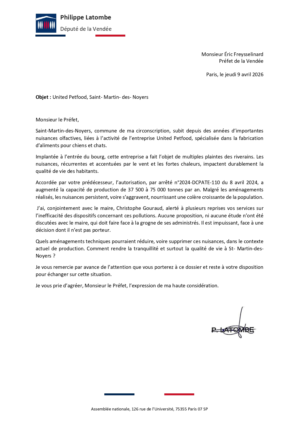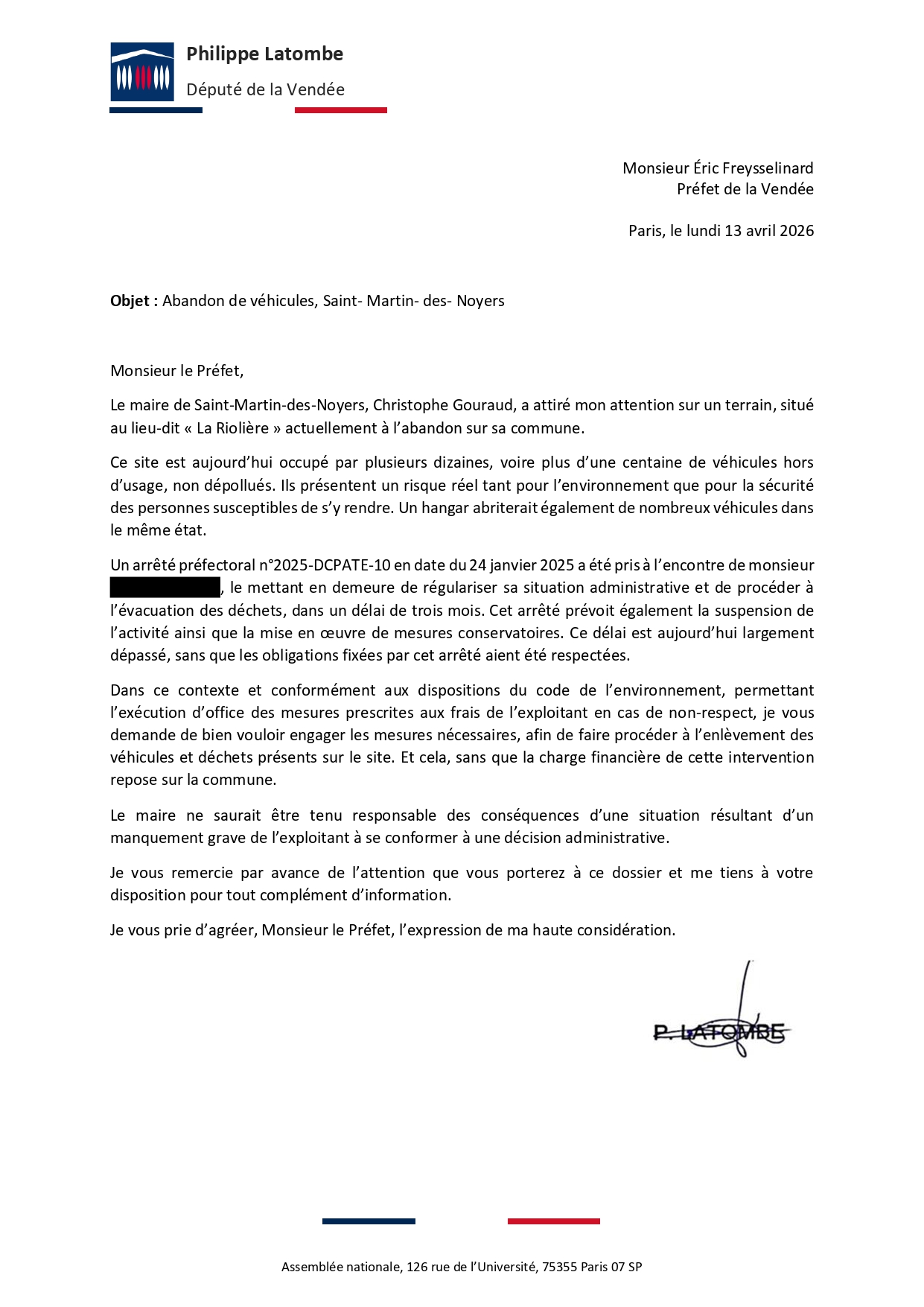 Philippe Latombe interroge le préfet concernant deux situations difficiles du quotidien des habitants de Saint-Martin-des-Noyers.
