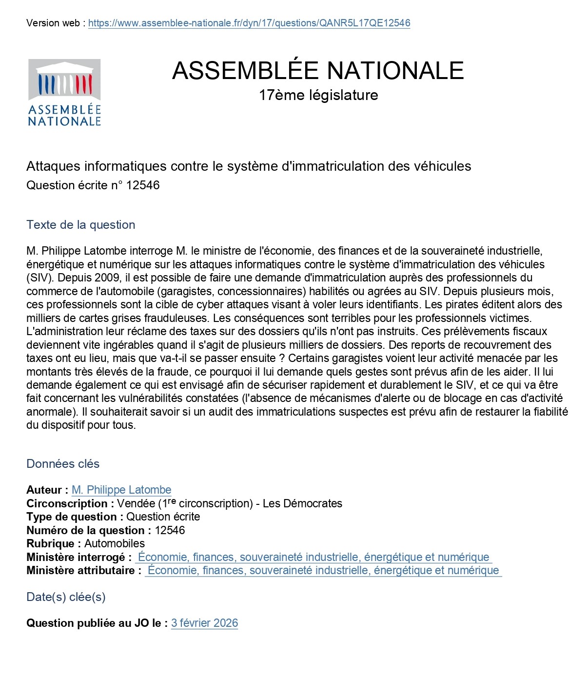 Le ministre de l'économie, des finances et de la souveraineté industrielle, énergétique et numérique sur les attaques informatiques contre le système d'immatriculation des véhicules (SIV).